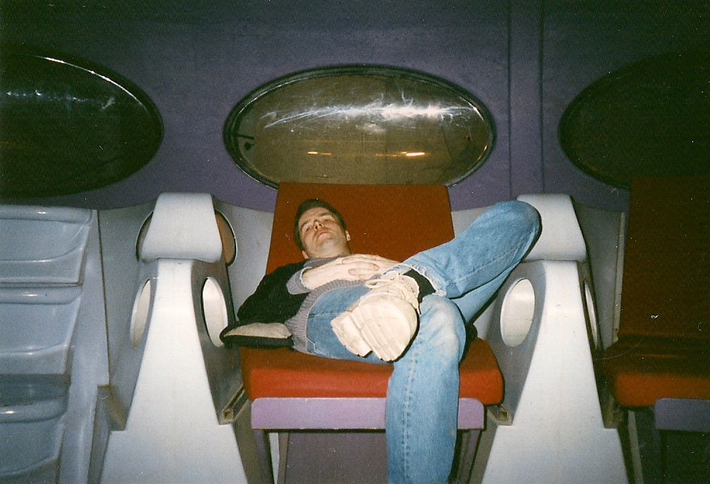 The final photo is testament to the fact that the chair/bed units in the Futuro were more comfortable than they might appear at first; Stephan was clearly able to relax in one!