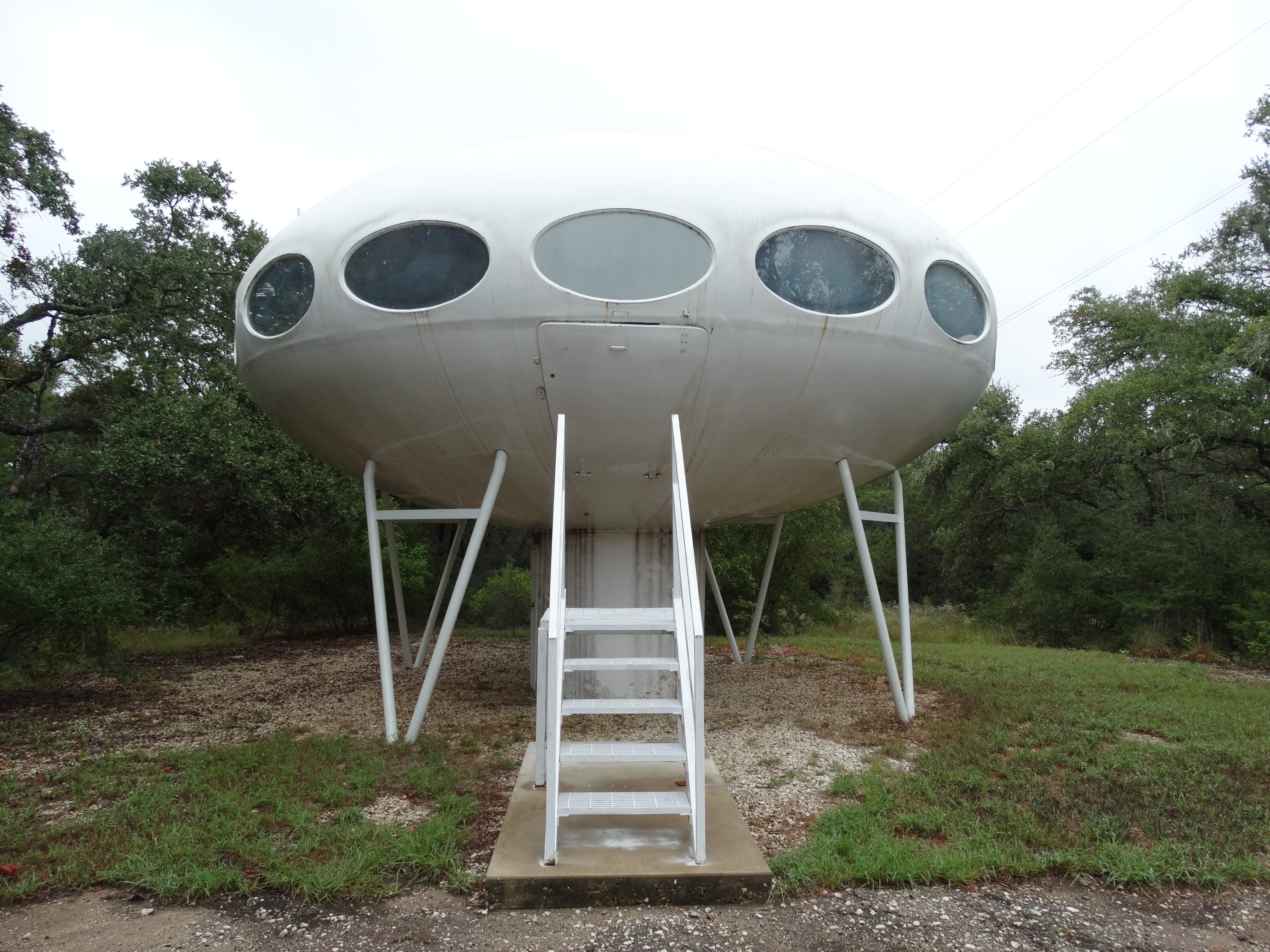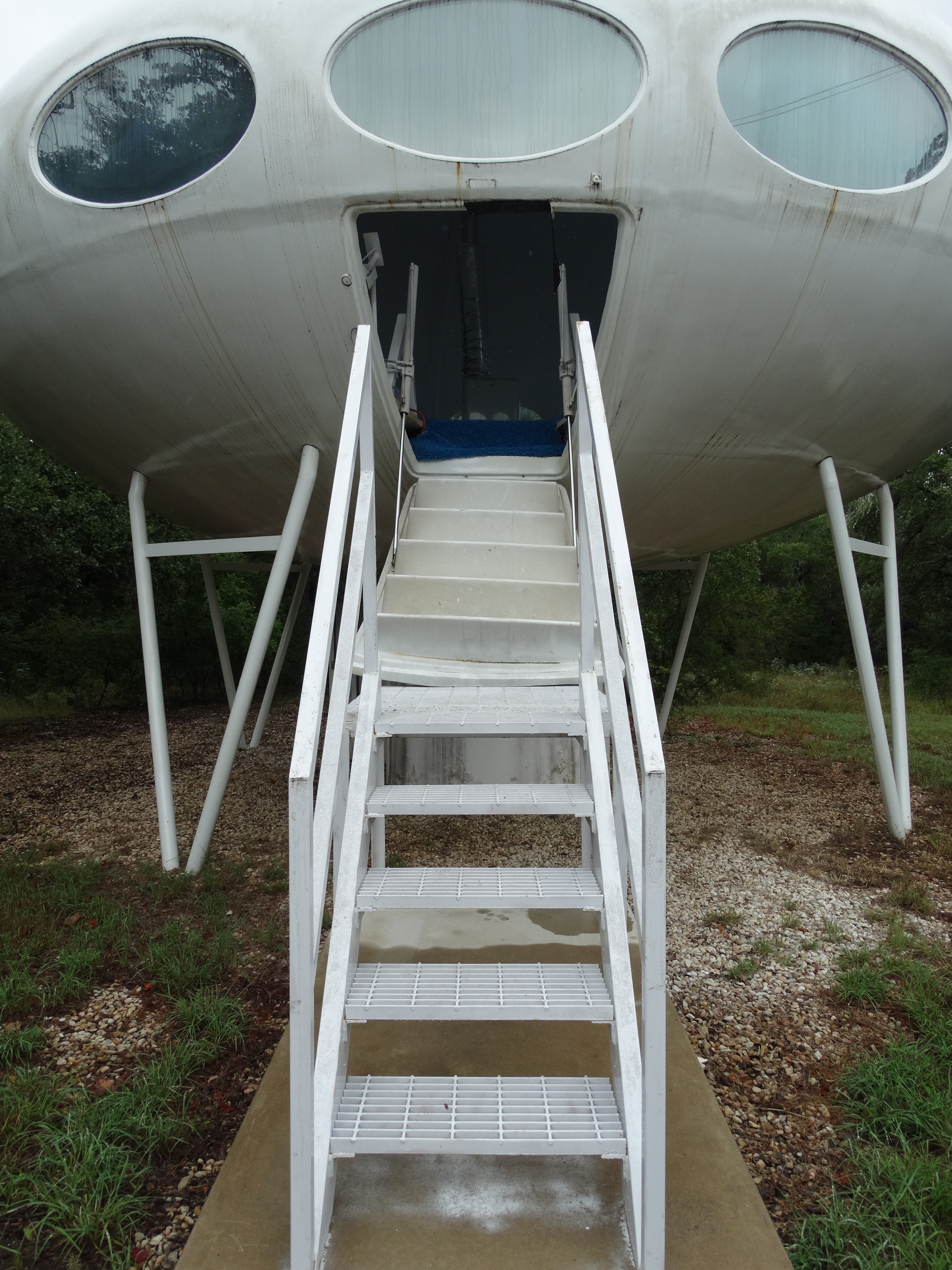 Ira tells us that the reason for the 8' legs and the higher than normal mounting of the Futuro was so that you could view the skyline of downtown Austin from the Futuro. Some 44 years later the trees have done what trees do and grown and the Austin skyline is no longer visible from the Futuro.
