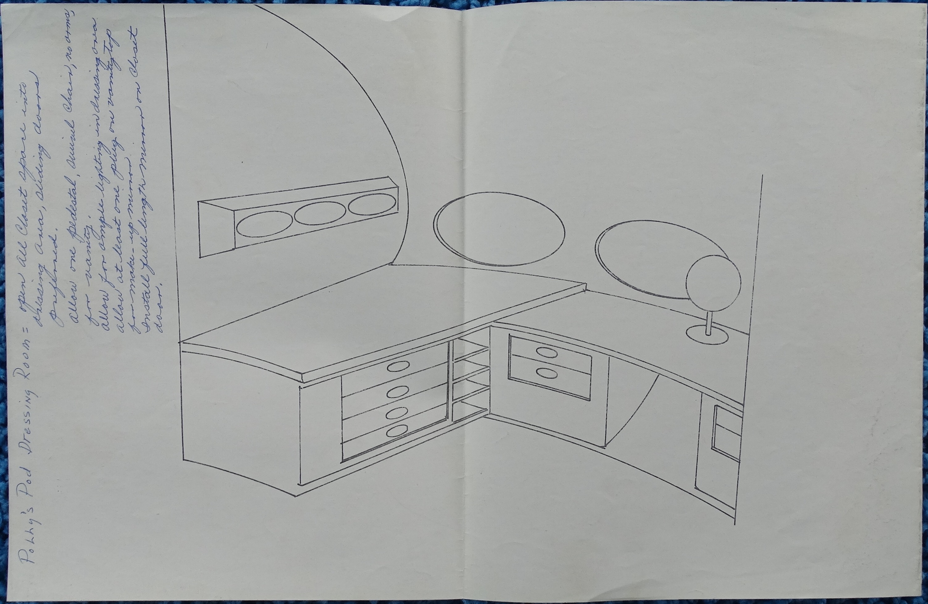 This set of four drawings is a further illustration of the ability to customize; they show various aspects of the interior configuration of the Futuro being constructed for Ira and we can also see notes made by Ira's mother "discussing" further options and requirements. Ira tells us that the unit as installed matched these drawings very closely.