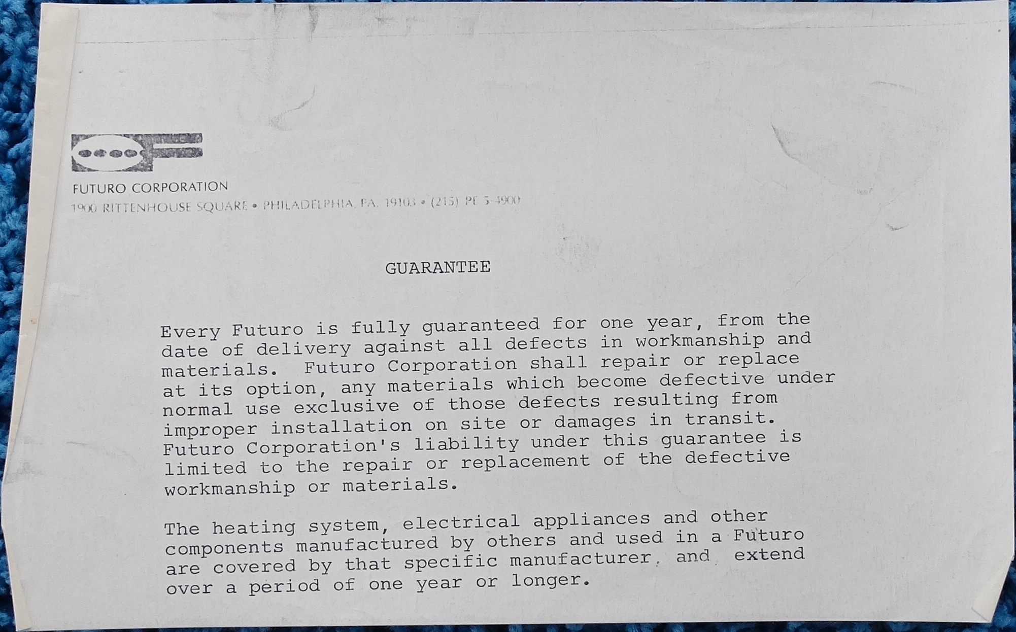 The Futuro Corporation offered a one year warranty on the Futuro House with the internal fixtures and fittings being covered not by the Futuro Corporation but by the original manufacturer's. In addition any defects resulting from improper installation or occurring during transit were excluded. The latter point is notable in that it presumably indicated that the transportation of the unit was the responsibility of the purchaser. If the shipper, in this case Futuro Of Philadelphia, were responsible for the shipment then presumably they would cover damages occurring in transit.