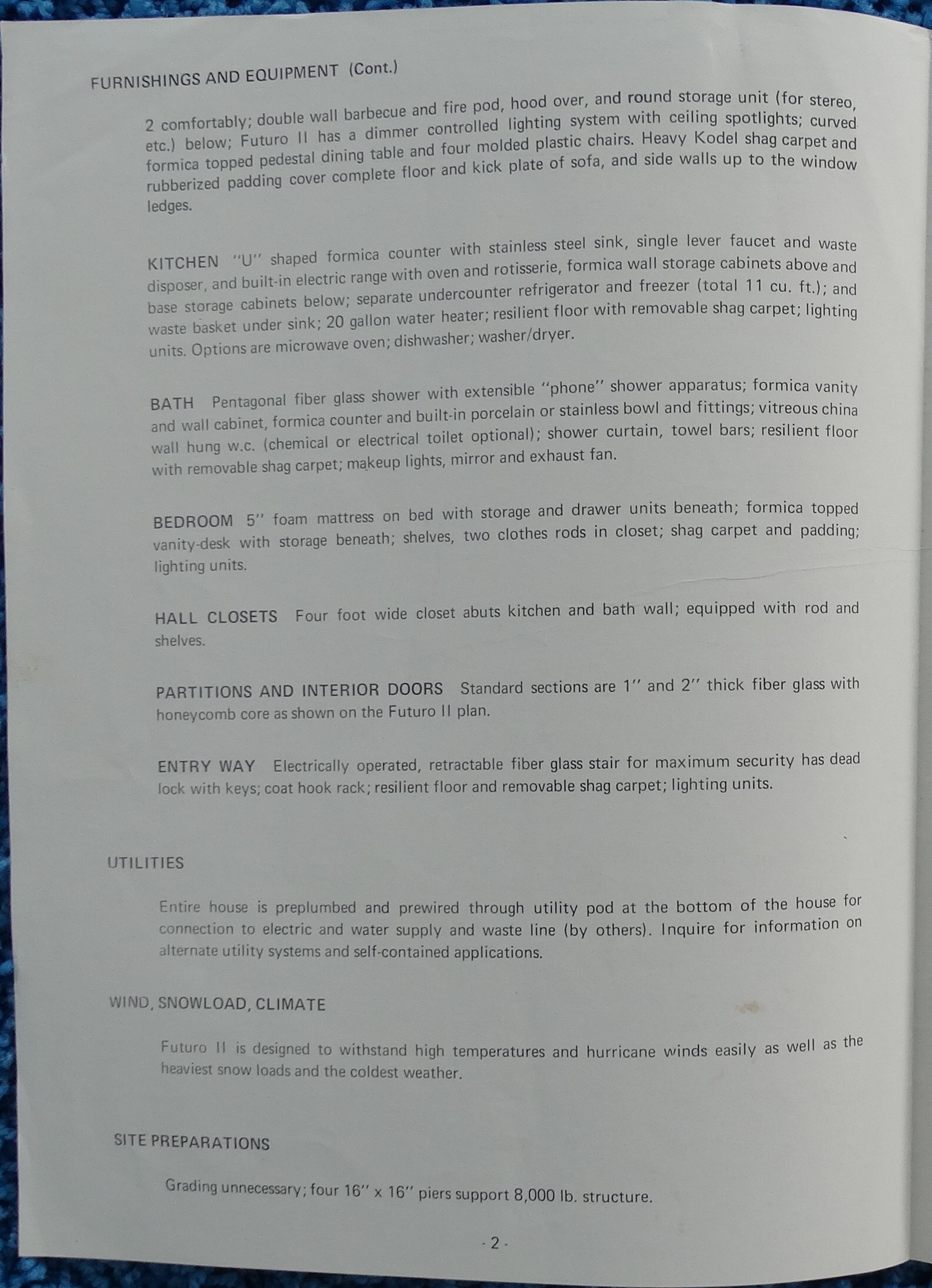The document shown below is a Fact Sheet about Futuro II, "Facts On The Futuro II Fiber-Glass House", and it lists some of the items that were available for customization (this document is very similar, but not identical, to this