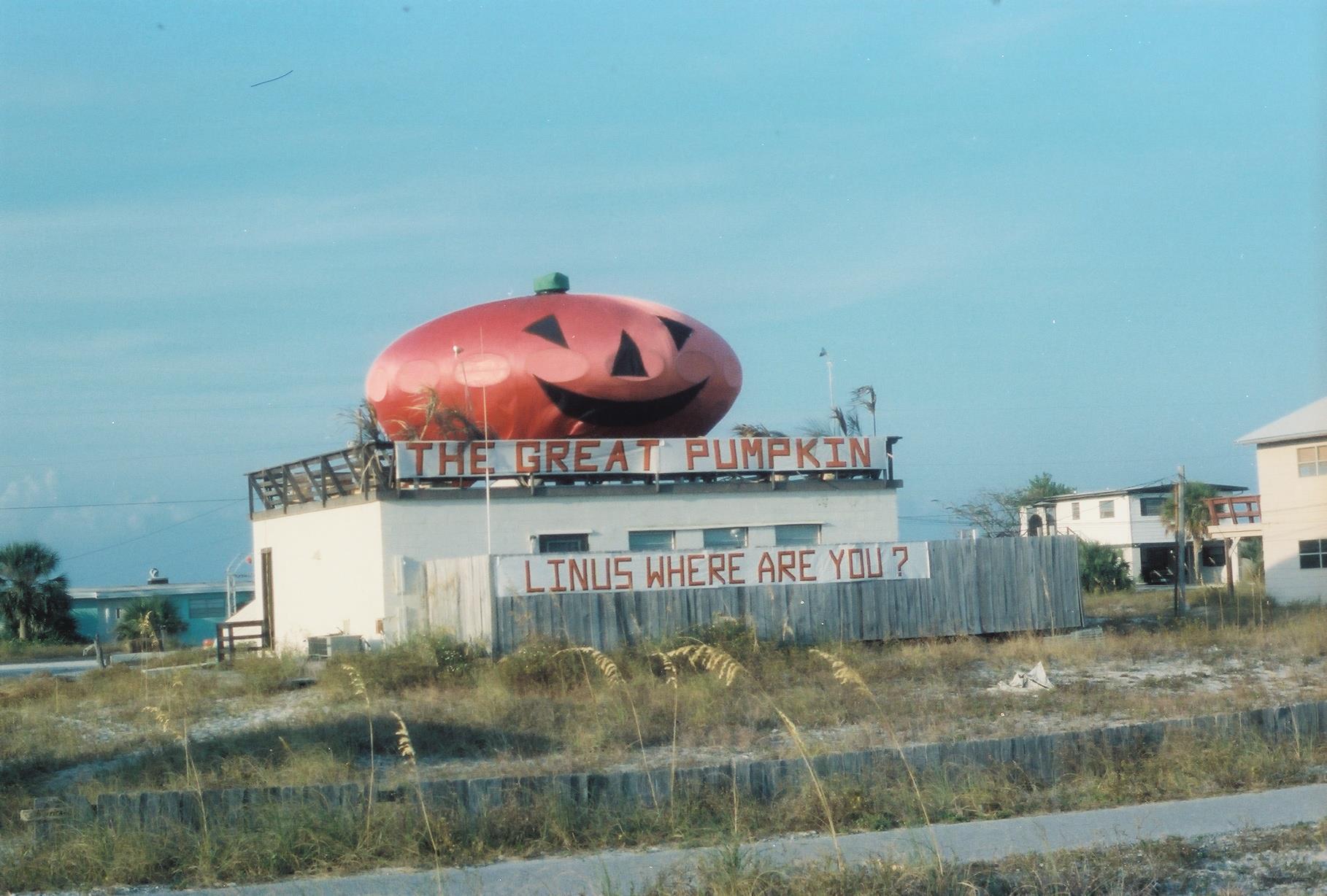 Finally, and appropriately as we are writing just a few days before Halloween, there is one final noteworthy comment on the RoadsideAmerica.com page; Lynne tells us that "At Halloween each year a large orange parachute, probably on loan from the nearby Pensacola Naval Air Station, transforms the UFO into a giant toothy pumpkin." After searching for a while we found this photo using Google Image search; the original page would not load so we are not sure where the photo came from so if you know it's origin please let us know so we can provide appropriate attribution. Thanks