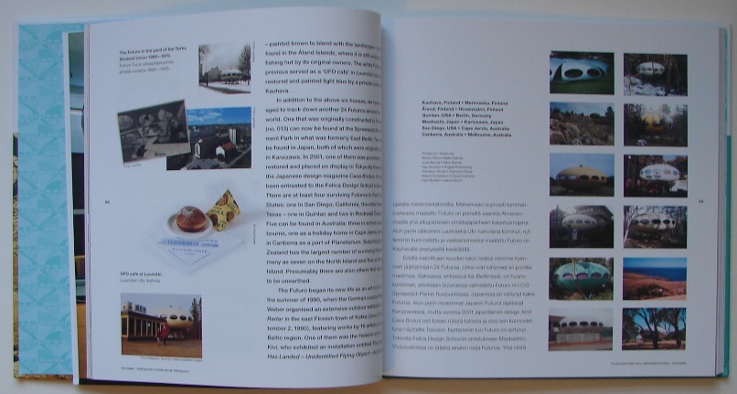 There are however several pages of interest to the "Futuro fan". Pages 160-161 carry a short article on the Futuro House along with some photographs and we also find brief biographies of Matti Suuronen and Mika Taanila on pages 206 and 205 respectively.