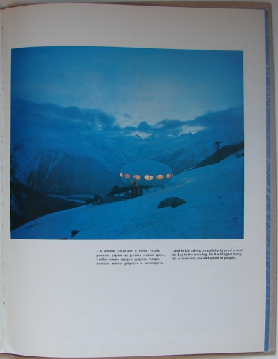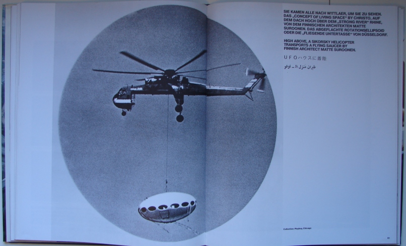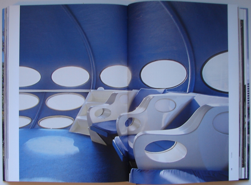 On page 44 of the book we see an interior shot of a Futuro; the same shot (cropped) is also seen on page 38. The photo is captioned "Matti Suuronen. Futuro House, 1968" but we cannot find any mention of the Futuro House or any reference to the photo in the text so we really have no idea exactly what point is being made or what the representation of the Futuro is actually supposed to communicate.