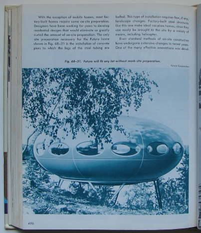 On page 71 there is a very brief commentary on the Futuro House. Interestingly it quotes the Futuro as having 20 windows, the configuration most often found in European examples, but it lists the prices normally quoted for the US market - $10,000 for the shell or $14,000 for a fully furnished model.