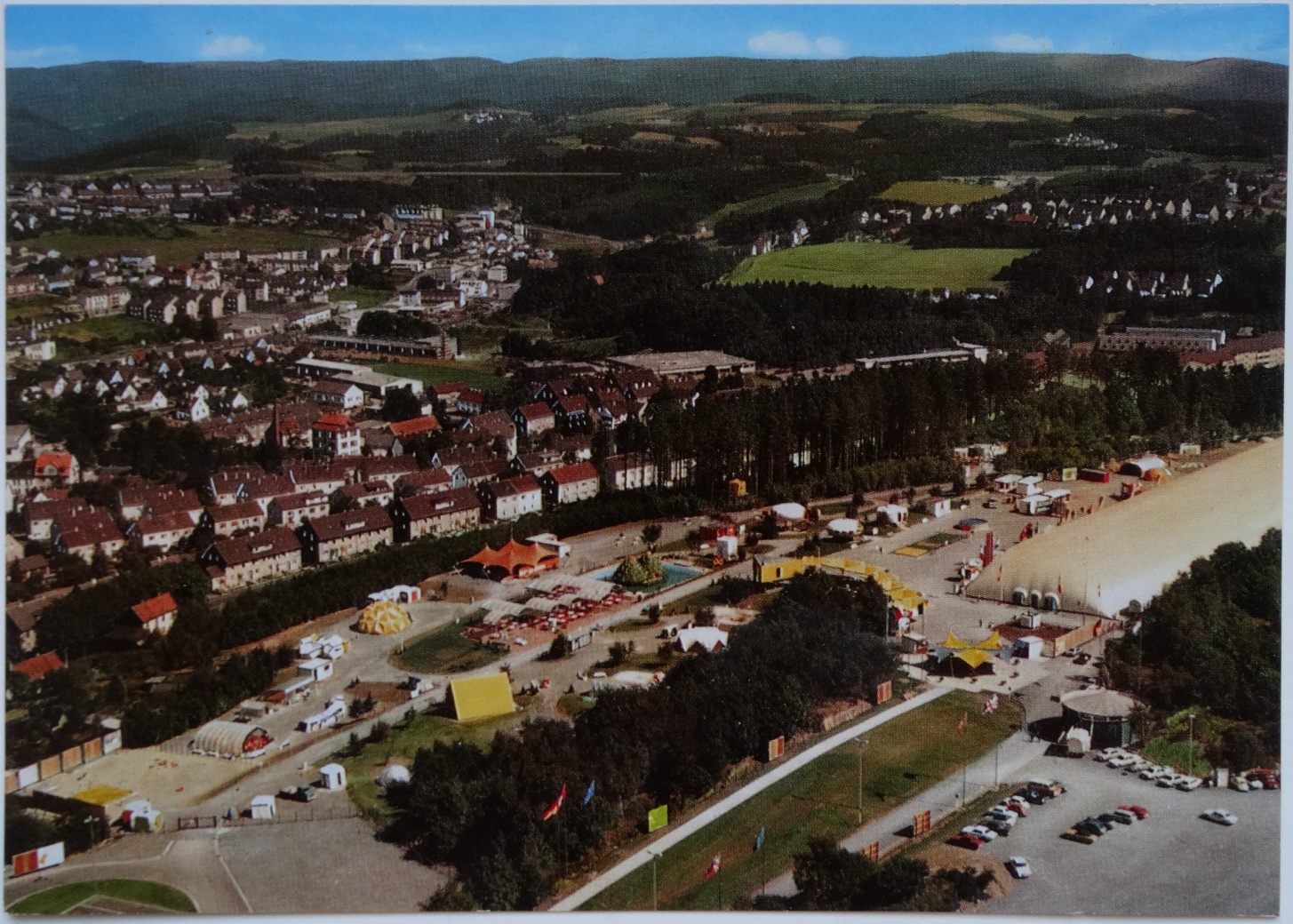 This postcard, undated but presumably from 1971, shows the IKA campus and is interesting in that it shows the scale of the exhibition and includes a large number of different "plastic" houses and other structures. The Futuro itself can be seen just below and to the right of the center of the postcard (the third photo below shows detail of this area of the postcard). A second postcard showing the exhibition can be found