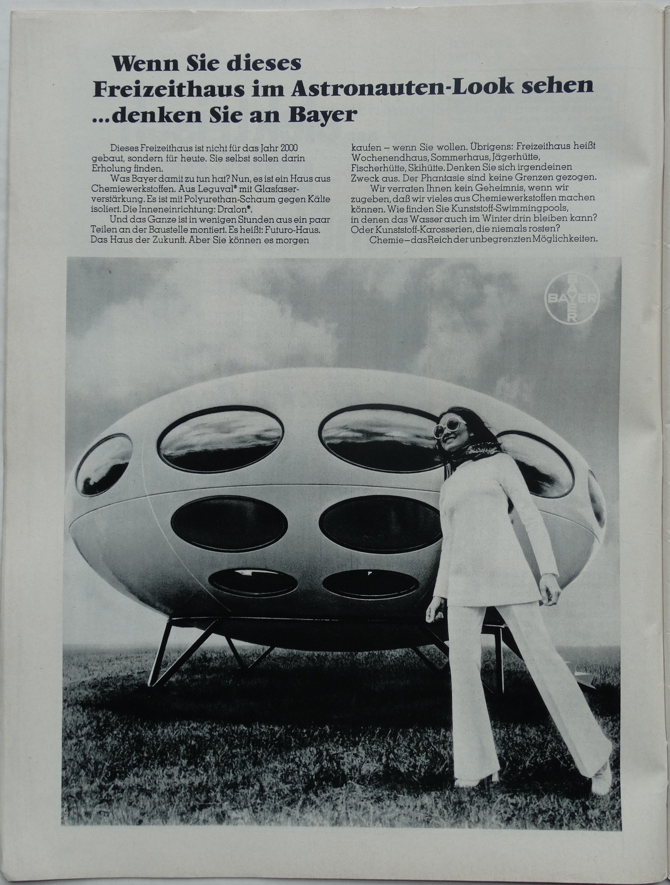 Though the Futuro is not the subject of the ad it uses the Futuro as an example of the type of futuristic construction that could be accomplished using materials manufactured by Bayer. The final sentence of the text reads, according to Google Translate "Chemistry - the realm of unlimited possibilities".