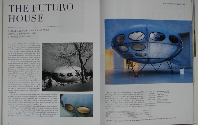 The December 2007 issue of Christie's Magazine includes a two page article on the Futuro House; though dated December it was clearly published earlier than that since the article talks about the "upcoming" November 27th auction. Interestingly it features a photograph of the Futuro displayed at