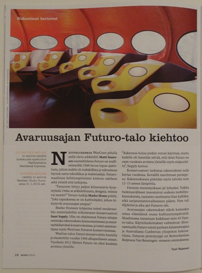 Finnish Museum Association and is distributed free at various museums around Finland. Issue #4/2015 of Museo includes an article on Futuro which includes an interior photo of the restored