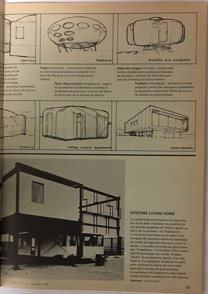 The March/April 1975 issue (#54) carried an article titled "Maisons En Plastique Oui Ou Non?" (or "Plastic Houses Yes Or No?"). Pages 52-53 carry a series of small diagrammatic images of various structures along with a brief description; the Futuro is one of the structures included.