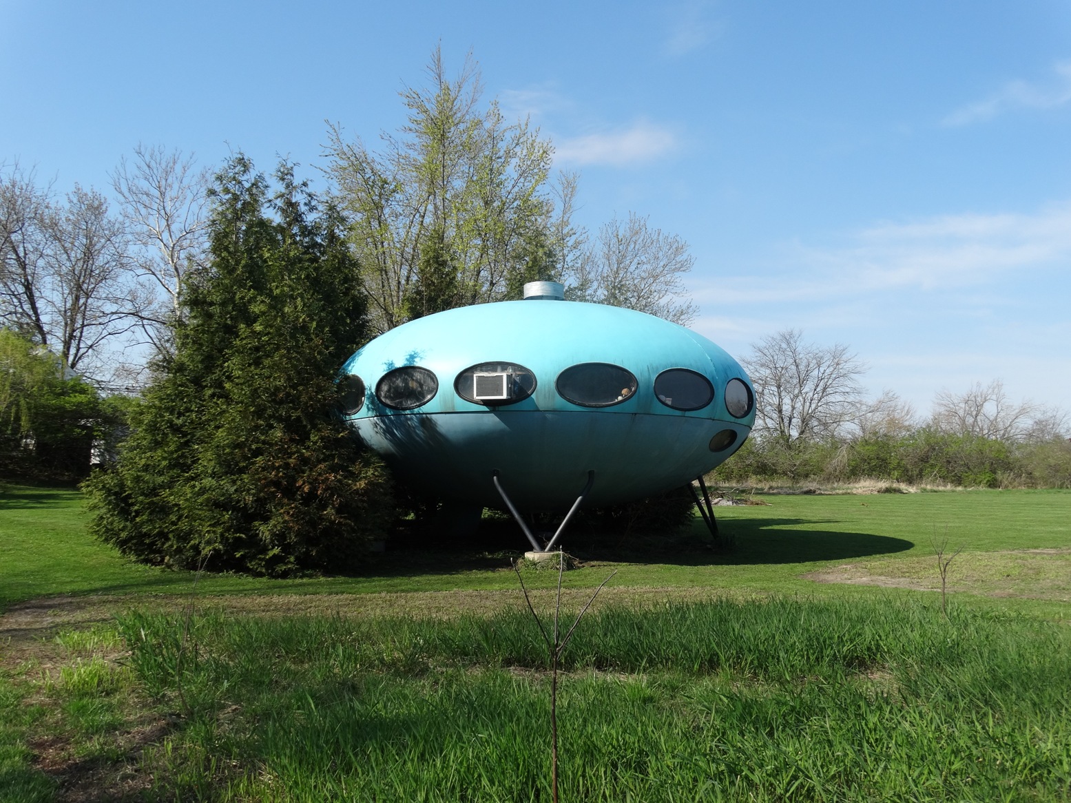 "I can 100% confirm that there was indeed a Futuro house in the lake community (Heritage Lake) just outside of the town of Mackinaw IL. As a kid my family owned property at the lake and every summer we would go camping there and every summer we'd make a little trip down the side roads to see the "flying saucer house" ... It was used as a little summer getaway "cabin". Whenever we would visit the owners were never there. I always hoped to see the inside. It was perched on the side of a hill (overlooking the water). Going up the hill a bit we could get close to being level with the porthole windows but they were always covered with curtains so we never could see anything inside ... It was light blue ..."