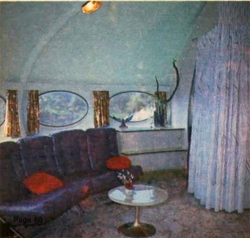 Spacebug's webpage and an archived article from the publication Designscape (Issue #86, 1976). The article is about Futuro Enterprises (Christchurch) Ltd. and it included the photo below to illustrate the interior of a Futuro.
