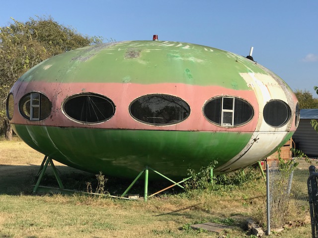 Interestingly the article suggests that the Futuro was "dis-assembled into five segments and then re-assembled in two parts on a truck for its trip to Texas". Difficult to envisage a Futuro being dis-assembled to five segments; maybe the top half was broken down to four segments so the bottom half could then be loaded onto a truck with the top half then being reassembled again for transport? The article included a single photograph, presumably of the Futuro as it appeared in Marshall at the time.