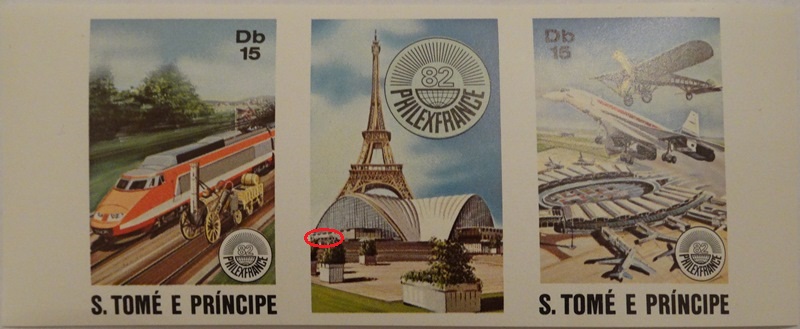 A mint strip featuring two stamps issued by the República Democrática De São Tomé E Príncipe to mark PhilexFrance82. The stamps themselves do not include the Futuro but the graphic in the center of the strip which carries an image of the CNIT does show the Futuro (very small and difficult to see) in front of the CNIT.