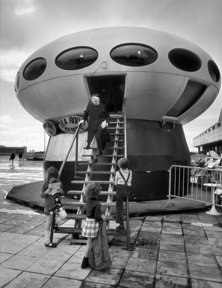 Finally this is the photo referenced above, courtesy of Patrik Barret/La Maison Futuro that shows the Futuro back in its days as the "Resto'Bulle".