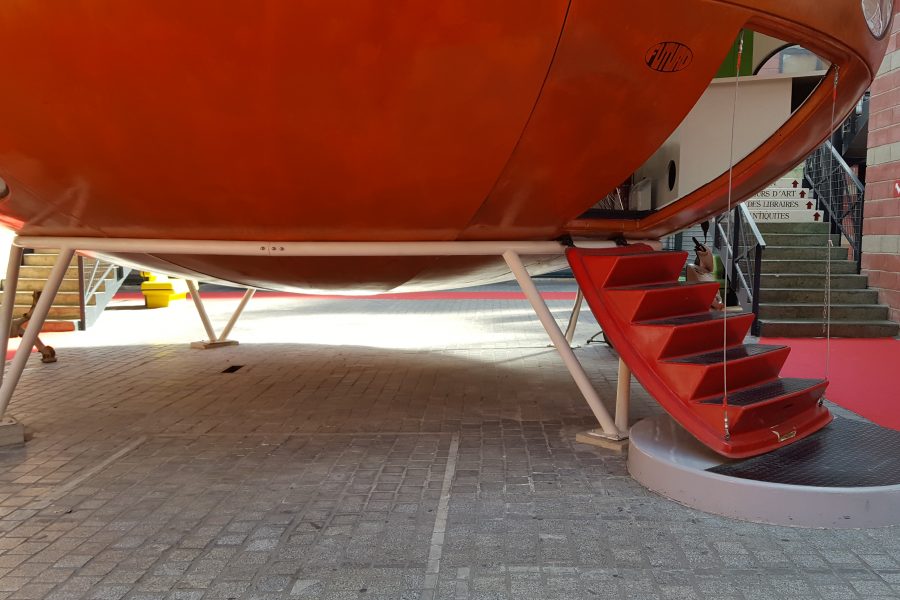 This interesting video shows the Futuro being reassembled on site in its new location; the Marché Dauphine.