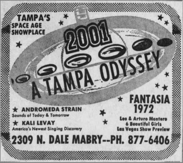 The photo below, a 1972 ad for the 2001 Odyssey Club, was featured in the Tampa Bay Times article. The image is displayed here courtesy of the Tampa Bay Times.