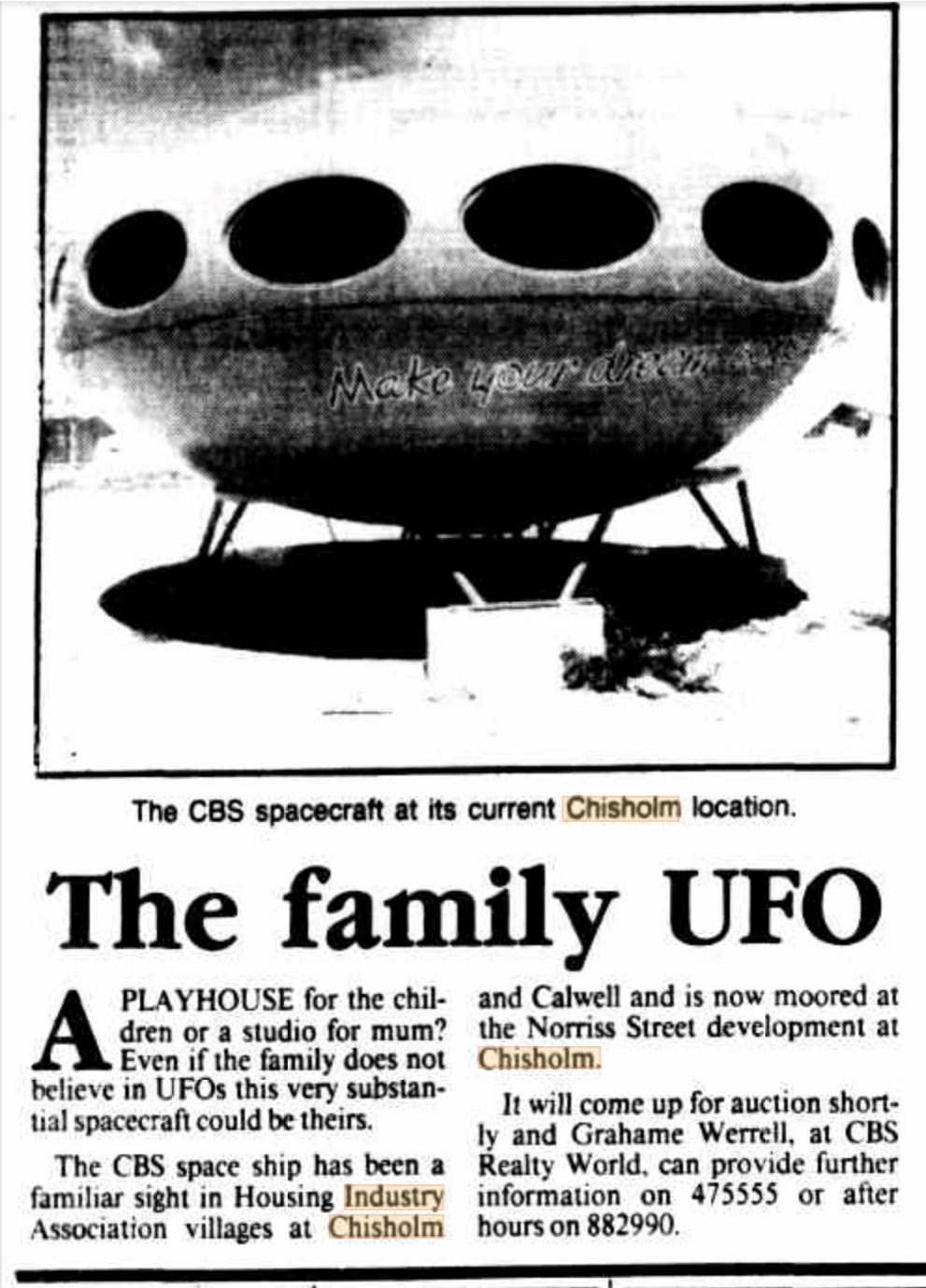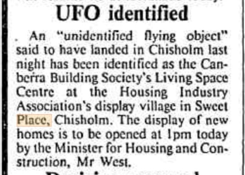 Chisholm. The "ufo" was to serve as the Canberra Building Society's Living Space Center at the display village.