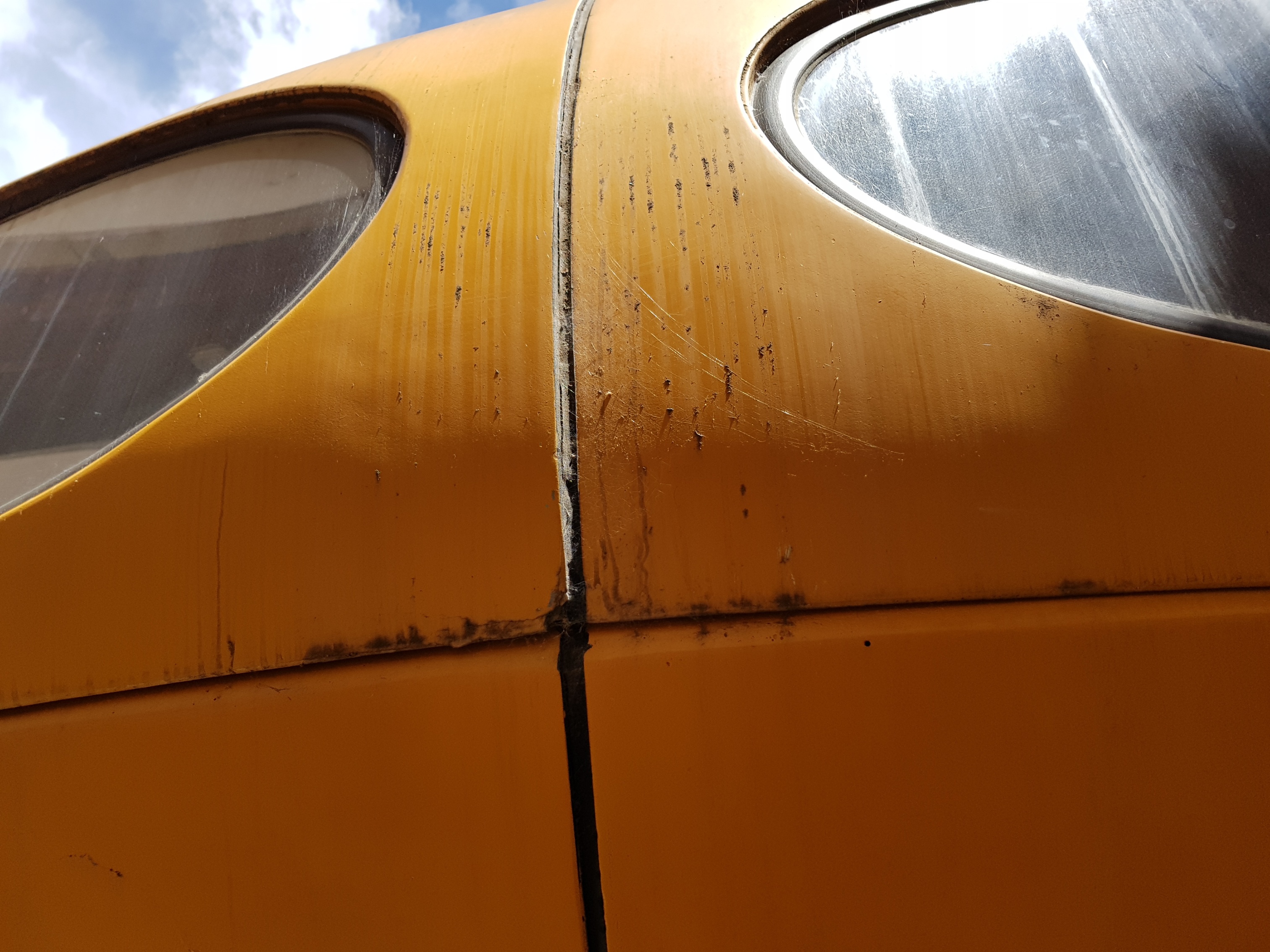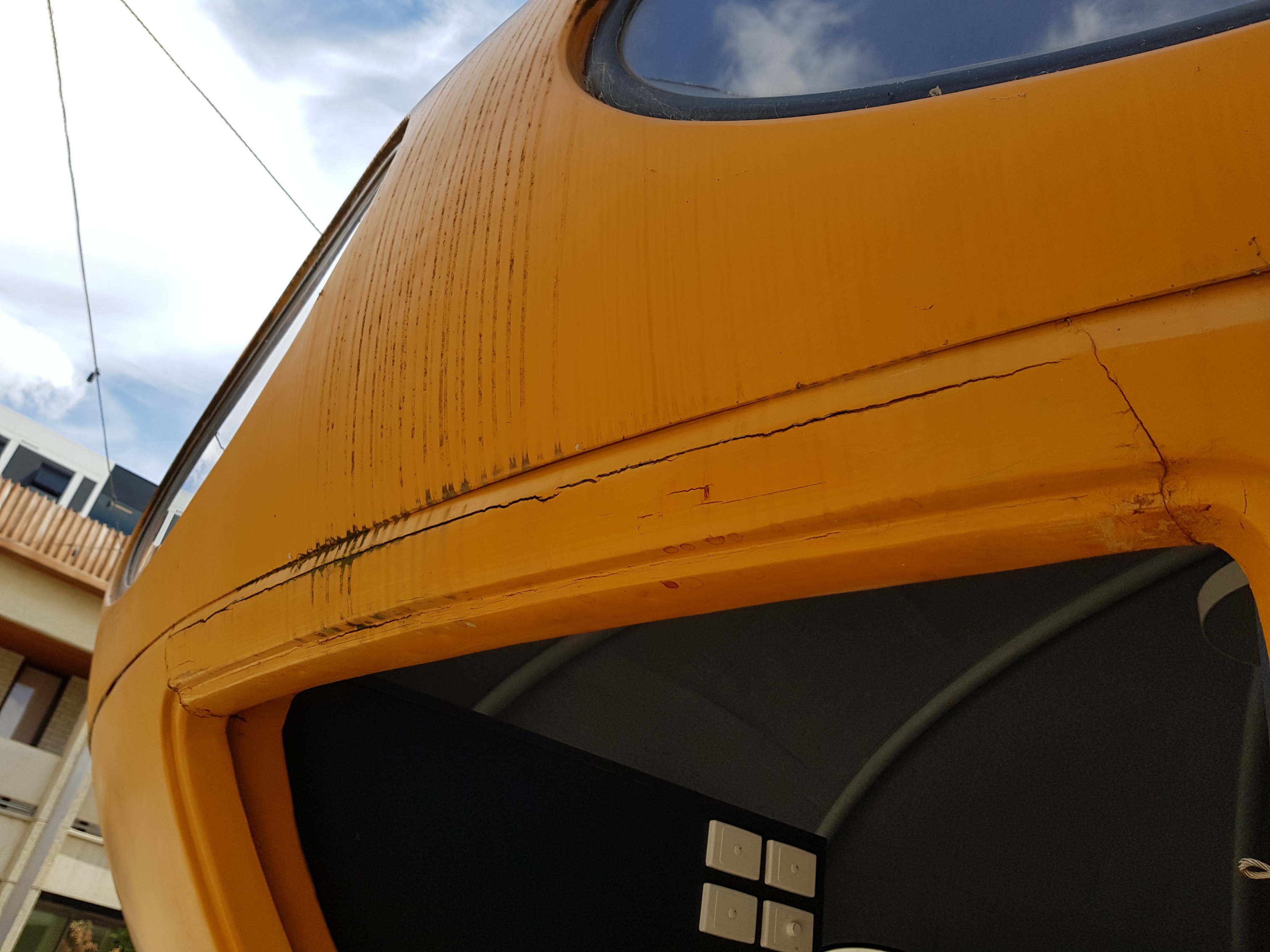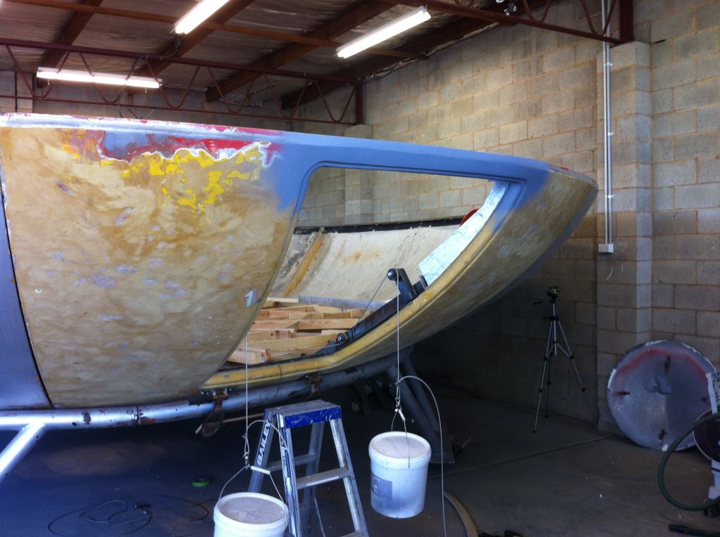 - Work on the upper panels of the Futuro which includes their being stripped back to the original ochre-yellow gel-coat and then having primer applied in preparation for final finishing
