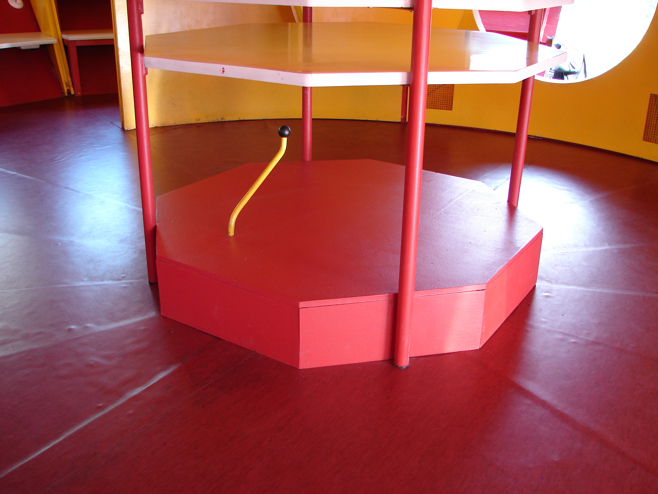 This pair of photos shows on the right the vent on the lower surface of the Futuro for the heating and a/c system and on the left can be seen the control handle to open and close the vent. Heat or cool air was actually passed through conduits under the floor of the Futuro and entered the unit through vents at the rear of the chair/bed units.