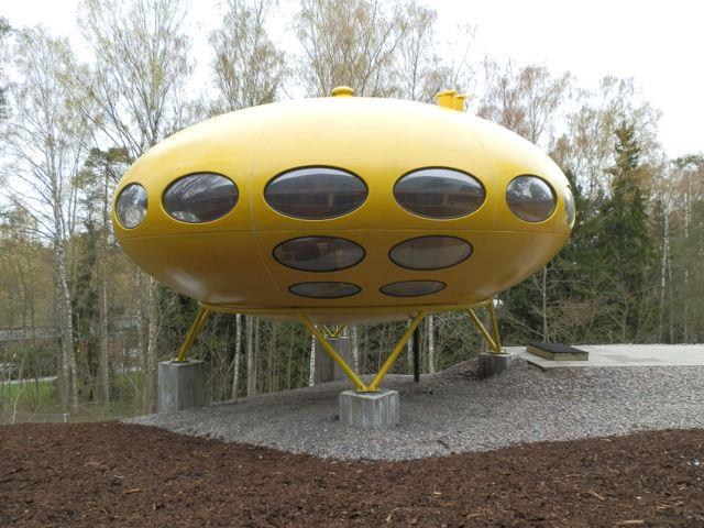 this photo of Futuro #002 during the time it was located on Lake Lahnajärvi and