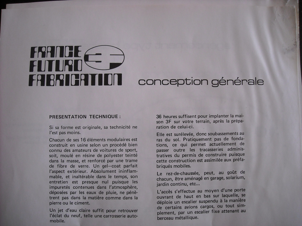 futurohouse also includes in his set of images of this Futuro a couple of shots of a brochure or pamphlet (in French) entitled "France Futuro Fabrication - conception generale" (1, 2) which translates to "France Futuro Manufacturing - General Design" in English. We assume that this pamphlet was on display either inside the Futuro or inside the building; there is no commentary with the images indicating this is so but they carry the same tags so that is our assumption.