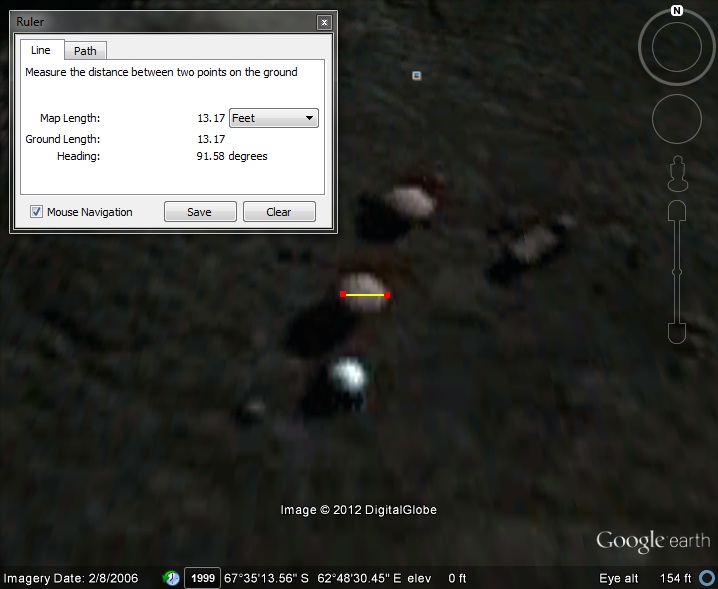We know that the Futuro House is approximately 8 meters or 25 feet in diameter. Contrast that to a "Googie" which is only around 50% of that with a diameter more like 4+ meters or 13 feet. Check out the screenshots from Google earth below which show one of the two "Googies" on Béchervaise Island, the "Googie" at Waterfall Bay on Macquarie Island and the Futuro in Royse City, TX respectively. Google Earth's measuring tool is by no means an exact tool but it does provide a good approximation of distance and clearly the difference between the "Googies" and the Futuro is significant.