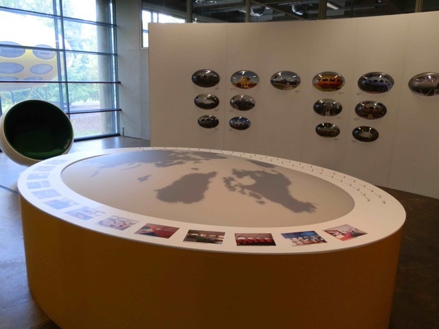 The installation features information and photos around a central "world map". The "world map" is interactive and features 1960's style switches (remember those?) which activate Futuro "locations" on the map (this can be seen in the last of the photos below).