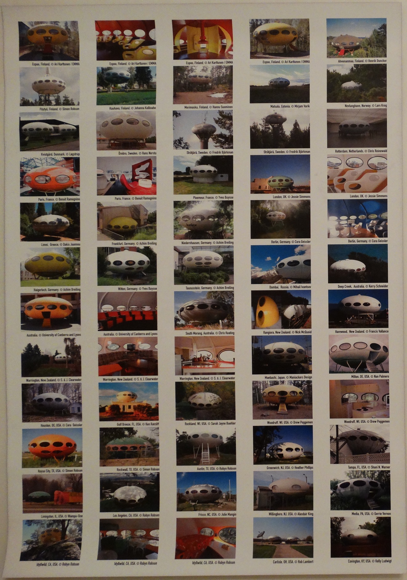 The exhibition will include a world map that would show the current location of known Futuros (this would be on a general city level, not a location specific "Google Earth" level ensuring the privacy of owners who prefer the location of their Futuro to be private is respected). The intention is to include, in most cases, a single exterior photograph of the Futuro though interior photographs will be included in some cases to showcase the variety of Futuro interiors. The goal is to represent with a photograph every known Futuro in the world.